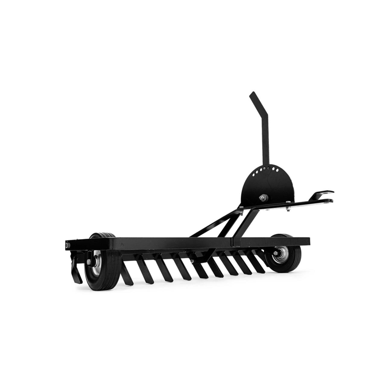 Robuste Schotterharke 110 cm mit Gummirädern und verstellbarer Arbeitstiefe. Die Zinken werden beim Rückwärtsfahren hochgestellt.