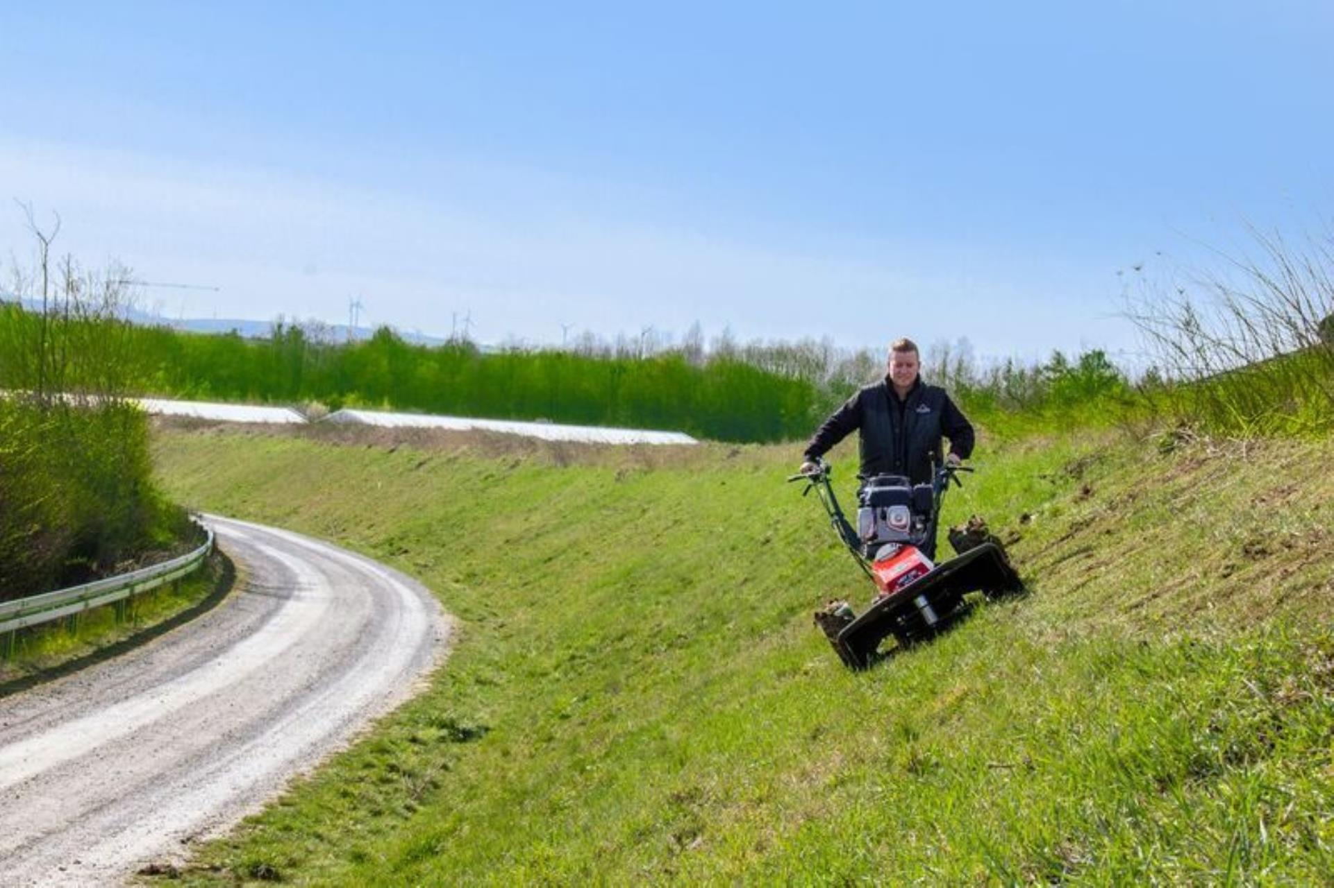 Die neue Profi-Serie für Hanglagen und Böschungen mit bis zu 100 % Neigung lässt sich durch die SYNCRODRIVE ™-Technologie, zwei unabhängige hydrostatische Motoren, einfach und bequem durch unwegsames Gelände manövrieren. Durch eine am Rahmen integrierte Stütze und Schnellverschlüsse lassen sich die serienmäßigen Räder mit Ackerstollenprofil durch geländegängige Stahlräder ersetzen, die für zusätzliche Traktion sorgen.